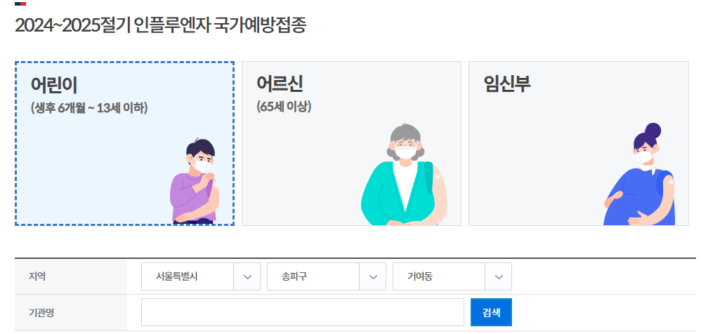 위 사진처럼 어린이/어르신/임산부 중 하나를 선택하신 후 지역을 누르시면 접종 가능한 곳이 쭉 나옵니다.